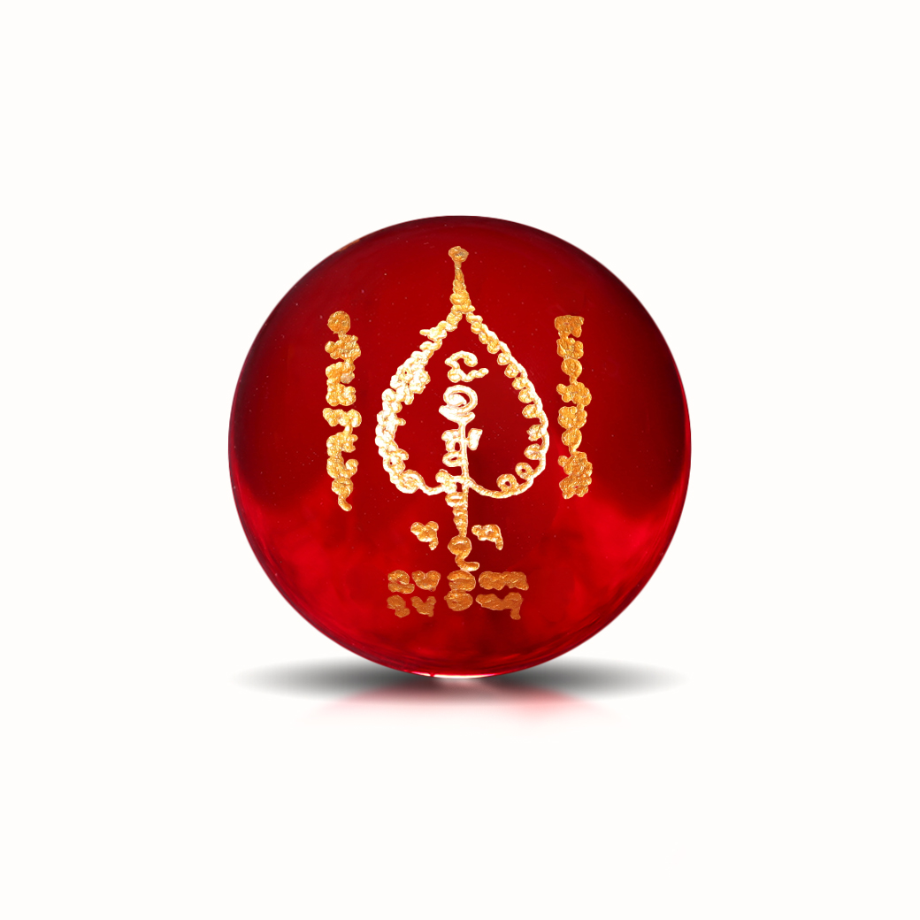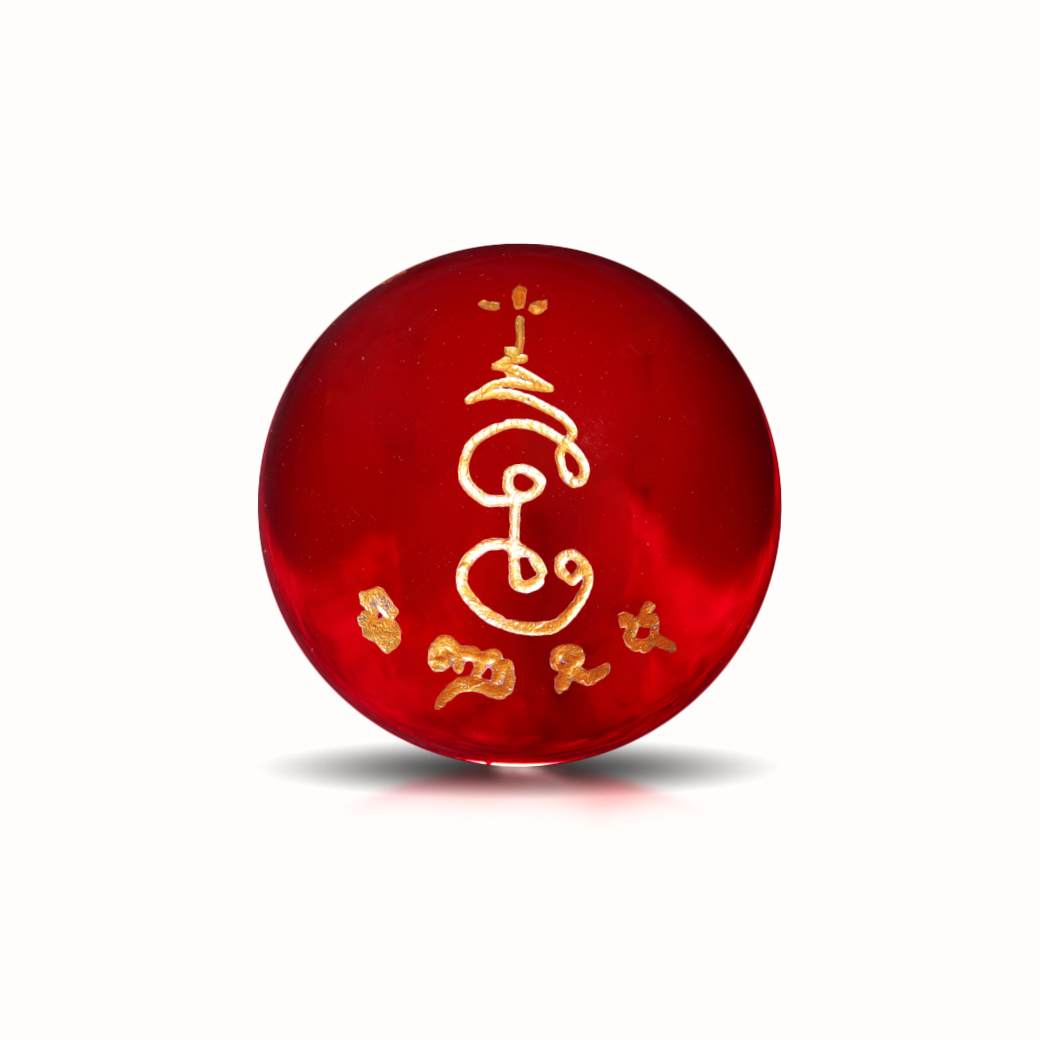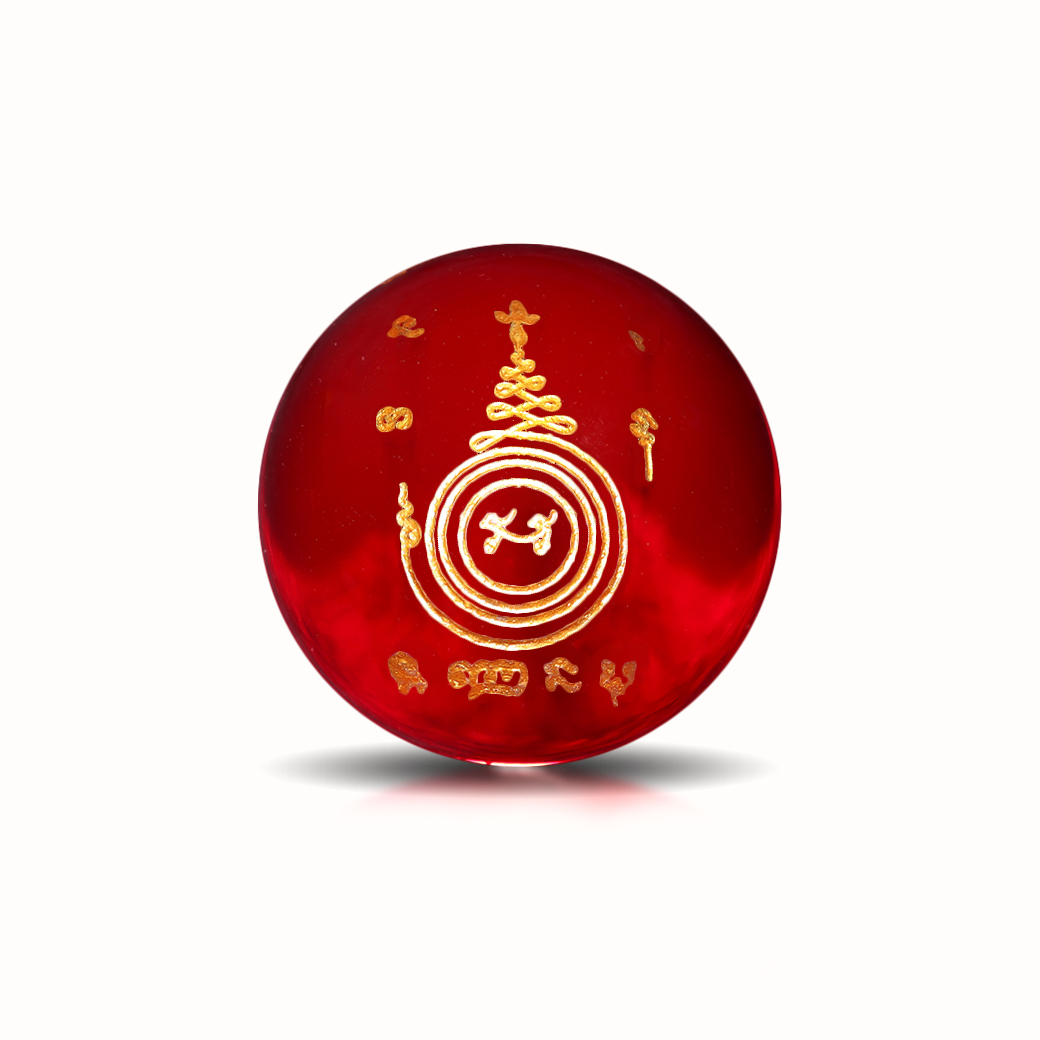 สีแดงหมายถึง สีแห่งอำนาจ เป็นสีอันทรงพลังกล้าหาญ เป็นที่เกรงขามสำหรับผู้อื่น ผู้ที่ได้ครอบครองลูกแก้วสารพัดนึกสีแดงนี้ จะต้องเป็นผู้ที่ปฏิบัตธรรม ฝึกฝนให้จิตมีสติ รู้เท่าทันอารมณ์ เพราะไม่ฉะนั้นจะมีผลกระทบไม่ดีเกิดขึ้นทั้งตนเอง และผู้อื่น สีแดงบ่งบอก ถึงโทสะจริต คือต้องการสิ่งใด ก็ต้องรวดเร็ว ดั่งใจต้องการ หากขักช้าก็จะเกิดความโมโหขึ้นทันที มีความเป็นผู้นำ ซึ่งจะช่วยส่งเสริมความมีสง่าราศรี แต่ผู้ต้องมีคุณธรรมในใจด้วย