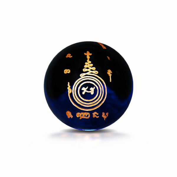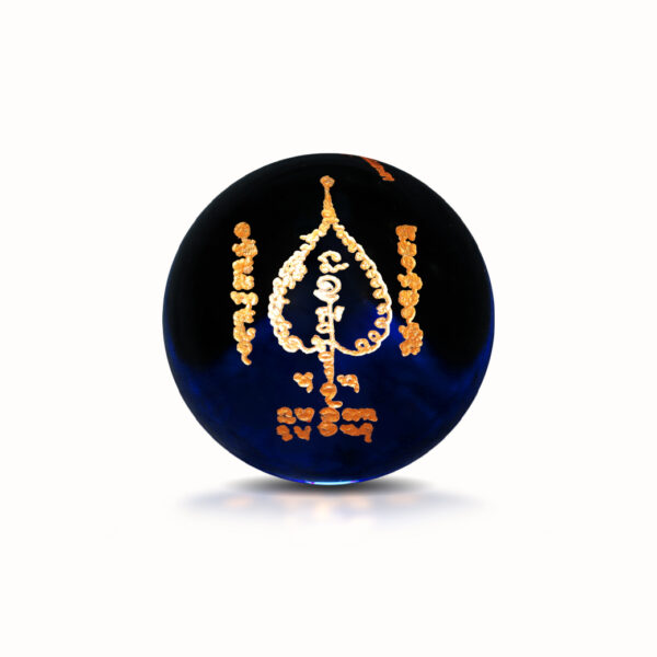 สีน้ำเงิน หมายถึง ผู้มีอำนาจวาสนา บารมีสูง มีลักษณะของผู้นำ บารมีน่าเกรงขาม มีทรัพย์สิน บริวารมาก สามารถเป็นที่พึ่งพิง แก่สรรพสัตว์ทั้งหลายได้ เนื่องจากมีพลังปกป้องคุ้มภัย จากภยันอันตรายจากทั้ง 8 ทิศ ผู้ที่ได้ครอบครองลูกแก้วสารพัดนึกสีน้ำเงินต้องมีบุญวาสนา ที่สั่งสมไว้ตั้งแต่อดีตชาติ มีคุณธรรมประจำใจ มิฉะนั้นจะเกิดอาถรรพ์แก่ผู้ที่ครอบครองได้ ผู้ที่มีบุญวาสนาได้ครอบครองลูกแก้วสารพัดนึกสีน้ำเงินควรทำ จิตใจให้ว่าง จากกิเลส ตัณหา ทำจิตใจให้เป็นธรรมชาติที่สุด