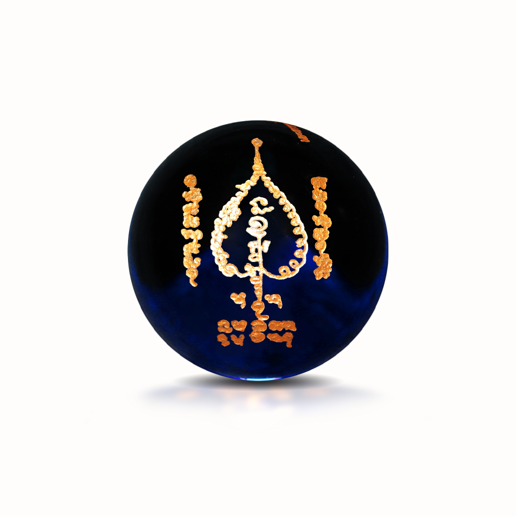 สีน้ำเงิน หมายถึง ผู้มีอำนาจวาสนา บารมีสูง มีลักษณะของผู้นำ บารมีน่าเกรงขาม มีทรัพย์สิน บริวารมาก สามารถเป็นที่พึ่งพิง แก่สรรพสัตว์ทั้งหลายได้ เนื่องจากมีพลังปกป้องคุ้มภัย จากภยันอันตรายจากทั้ง 8 ทิศ ผู้ที่ได้ครอบครองลูกแก้วสารพัดนึกสีน้ำเงินต้องมีบุญวาสนา ที่สั่งสมไว้ตั้งแต่อดีตชาติ มีคุณธรรมประจำใจ มิฉะนั้นจะเกิดอาถรรพ์แก่ผู้ที่ครอบครองได้ ผู้ที่มีบุญวาสนาได้ครอบครองลูกแก้วสารพัดนึกสีน้ำเงินควรทำ จิตใจให้ว่าง จากกิเลส ตัณหา ทำจิตใจให้เป็นธรรมชาติที่สุด